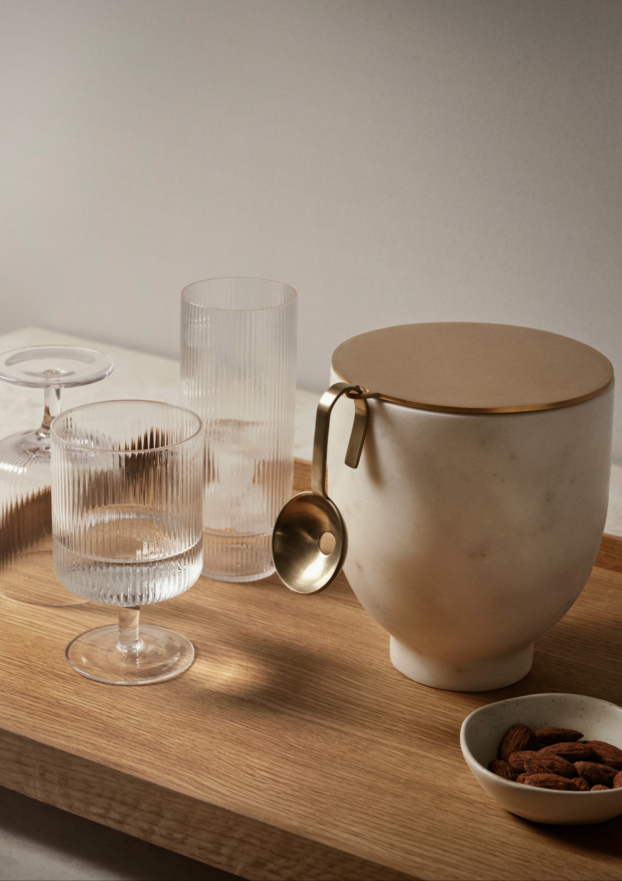 Para una copa informal en el jardín, una gran cena o como complemento elegante para un brunch, la copa de vino Ripple completará cualquier ambiente con su expresión única. Sopladas artesanalmente, las copas de vino presentan la característica superficie ondulada y silueta geométrica de la serie, lo que permite apilarlas.