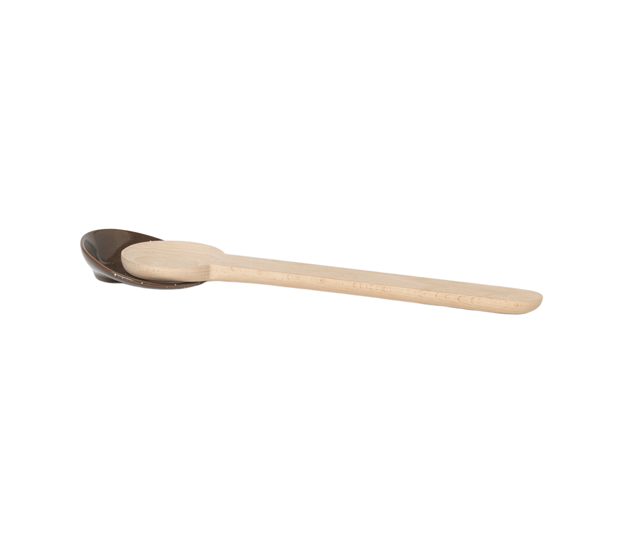 Juego de 2 cucharas de apoyo de la marca danesa Ferm Living. Fabricadas en haya. Soporte de porcelana esmaltada. Usa la cuchara grande de madera para remover las ollas en la cocina y colócala en el soporte para minimizar el riesgo de derrames y manchas.