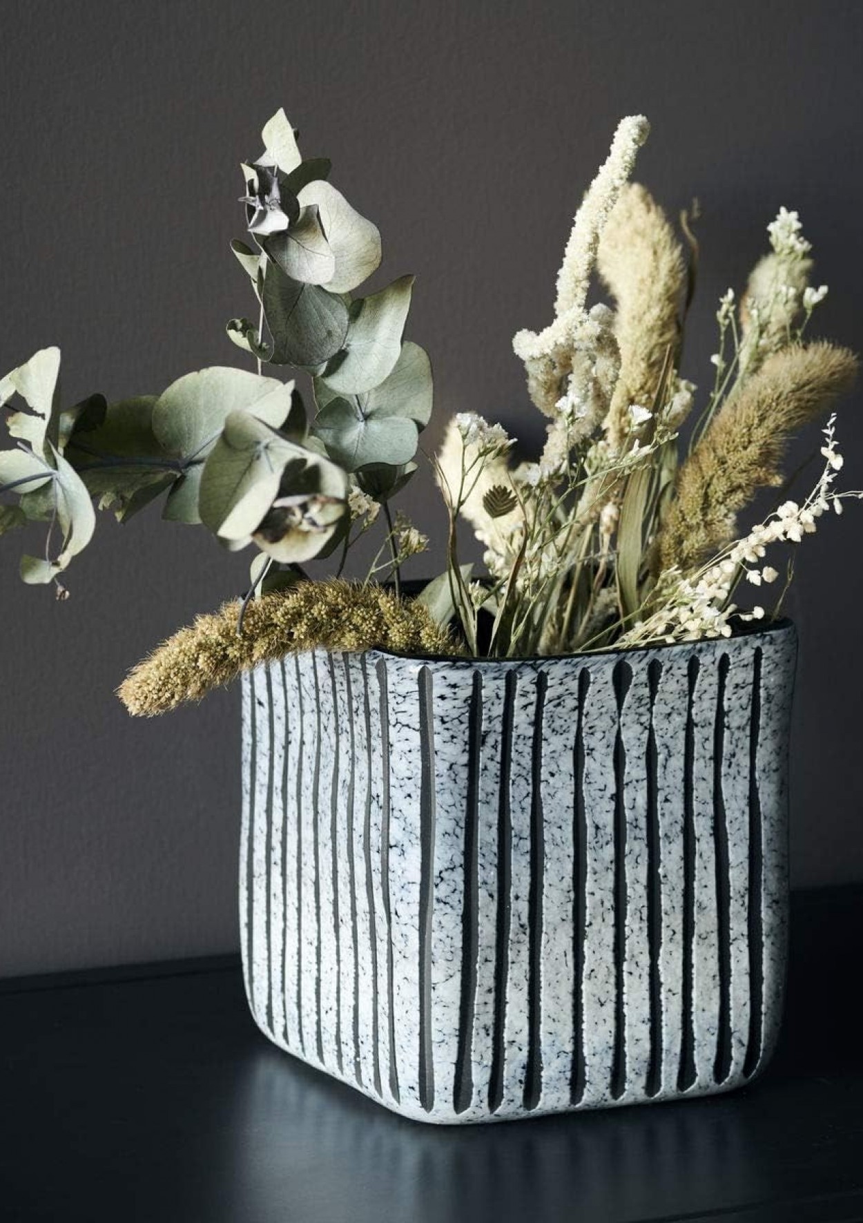 Dale protagonismo a tu planta con esta maceta de vidrio de House Doctor. Las rayas verticales irregulares cortadas en la superficie le dan a Surat un aspecto artesanal. Junto con el efecto mamore del esmaltado gris claro, se crea una maceta donde la superficie, la forma y el color se combinan de forma única. Coloca la maceta Surat en el alféizar de la ventana junto con el jarrón alto del mismo diseño para realzar el efecto. Otra hermosa alternativa es combinarla con elementos decorativos y candelabros de otros materiales en colores similares.