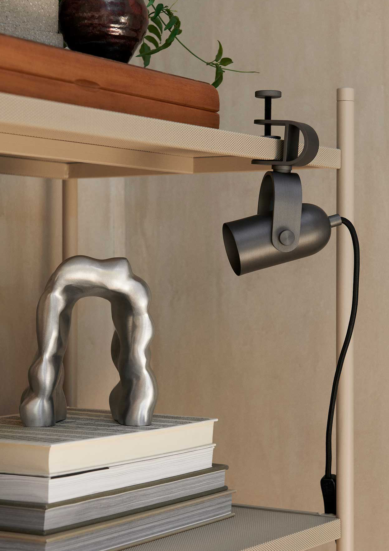 Inspired by industrial architecture and engineering, the practical and durable Ruuvi Lamp has a clean yet soft expression. Featuring practical thumb grip screws that have also inspired its name, the shade of the Ruuvi Lamp can be adjusted to provide light in any direction, while the clamp system allows the lamp itself to be attached to any surface in the home. Use the functional lamp to light up your beloved shelving system, for illuminating the pages of your favourite book while reading in bed, as a bright light when preparing delicious meals in the kitchen or in any other space where you need a practical light source that can easily be moved and adjusted.